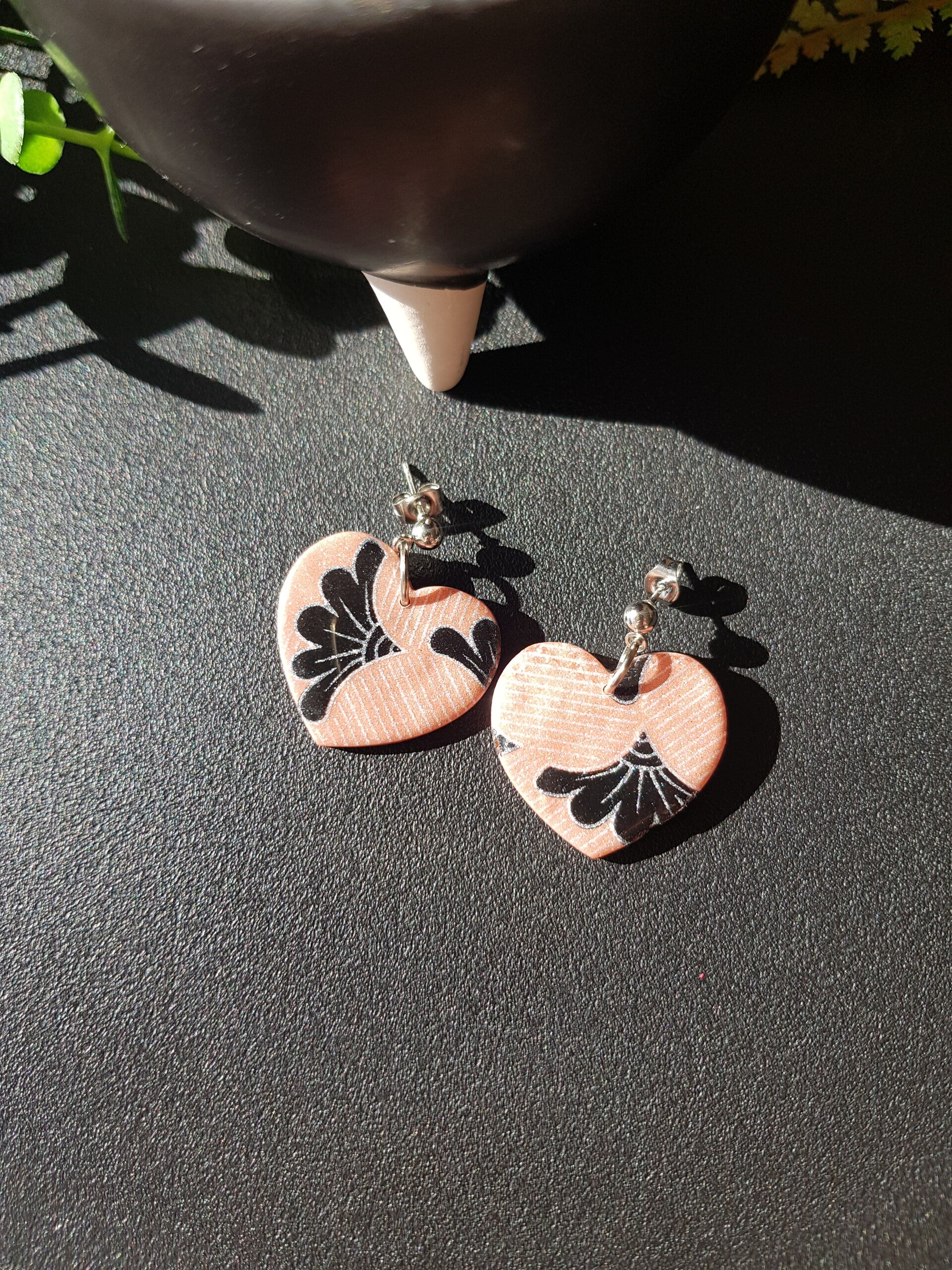 Boucles d'oreilles coeur imitation tissu wax rose et noir,