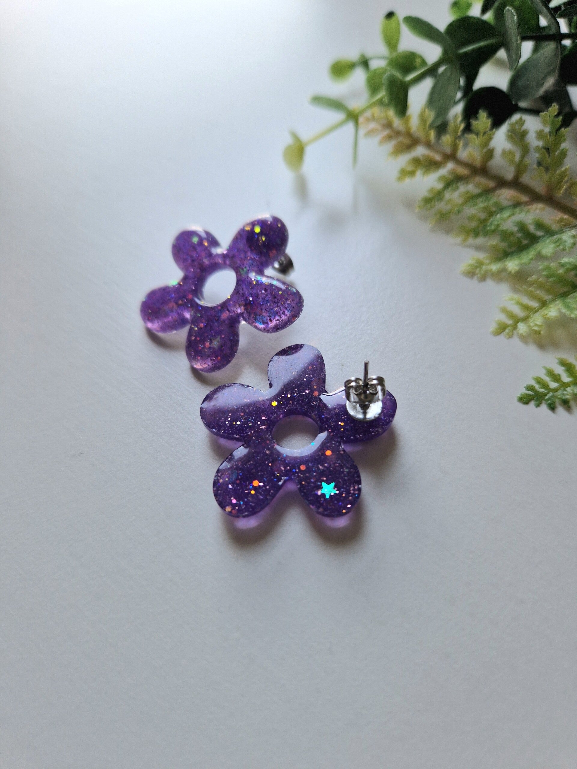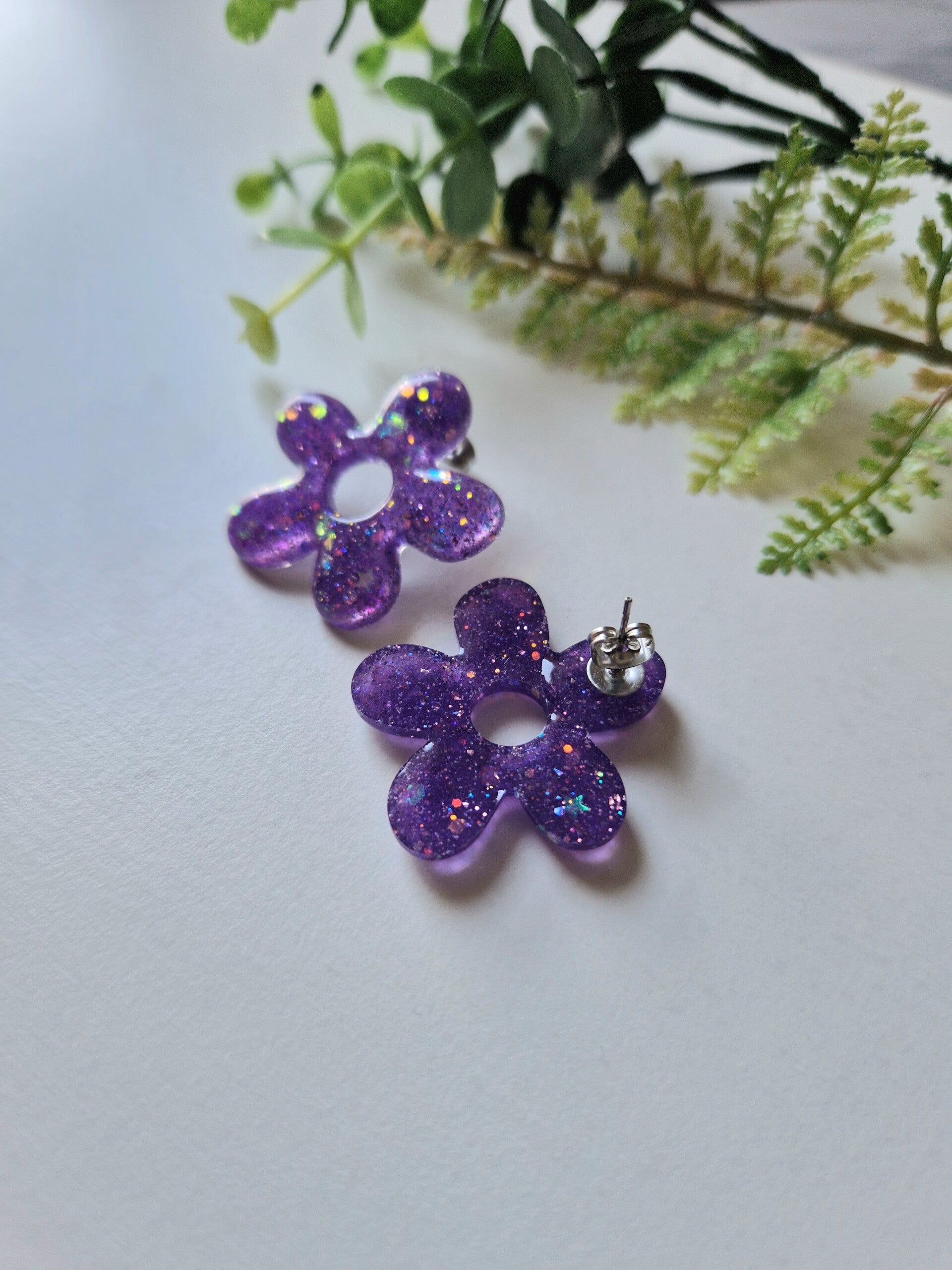 Boucles d'oreilles en forme de fleur en résine UV avec paillettes.