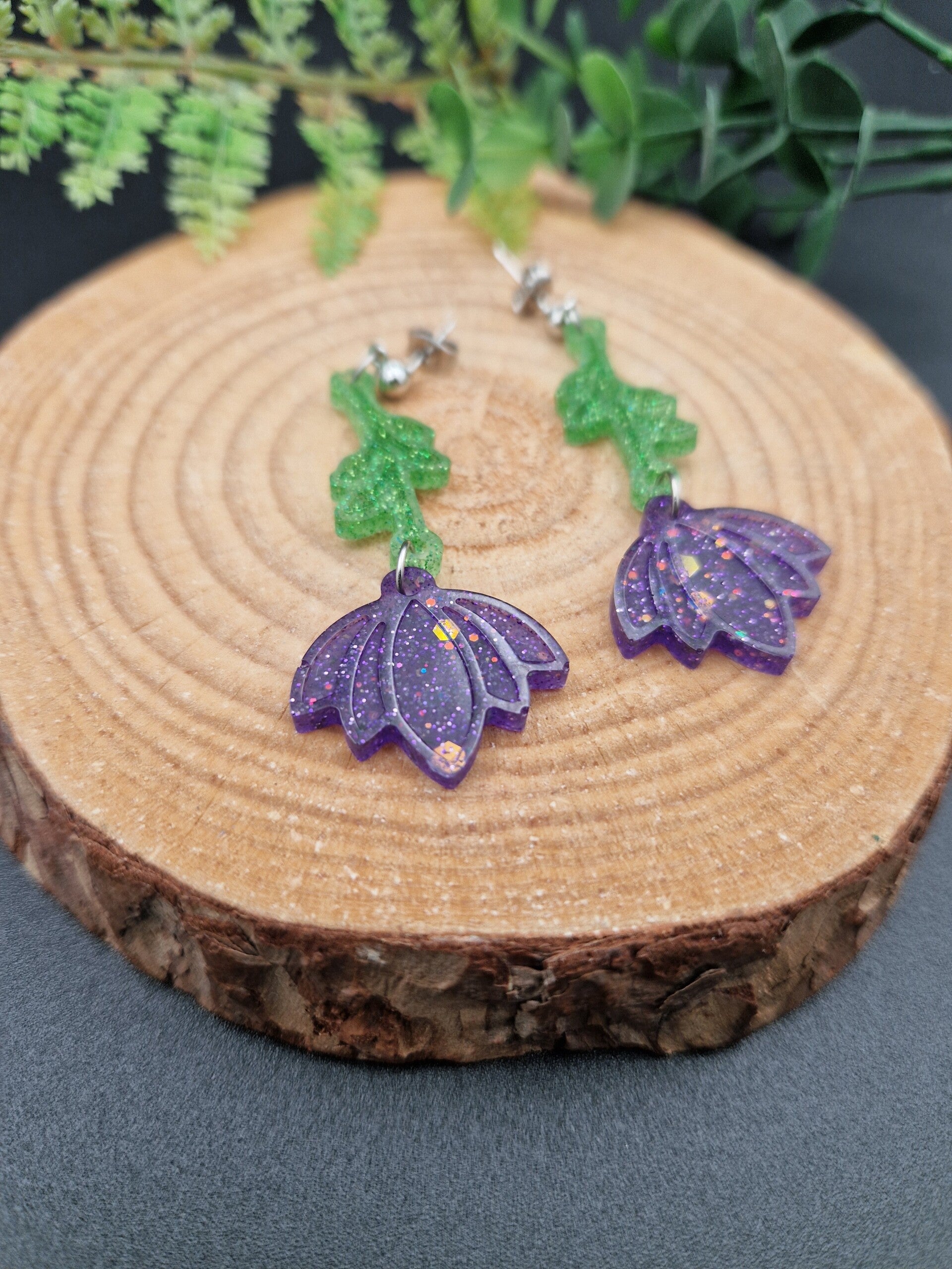 Boucles d'oreilles en forme de fleur en résine UV avec paillettes.